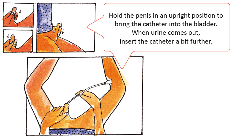 Put the catheter into the urethra until urine comes out.